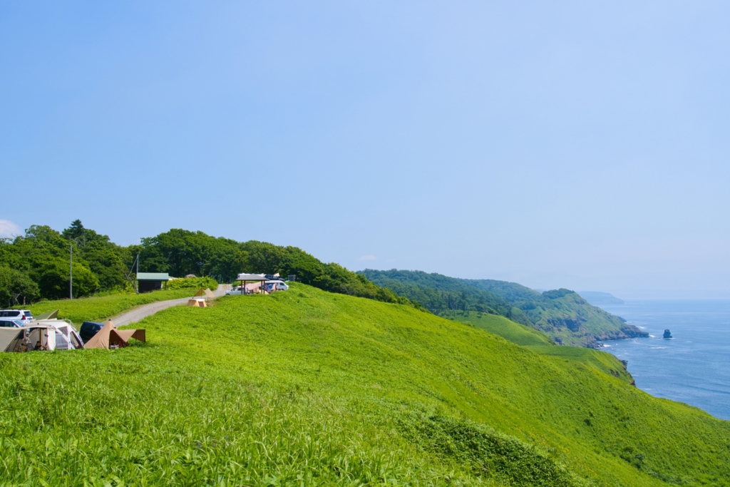 来止臥野営場は、釧路市の東、断崖が続く海岸線の上にある、天空のキャンプ場です。こんなロケーションの良いキャンプ場は、そうあるものではありません。