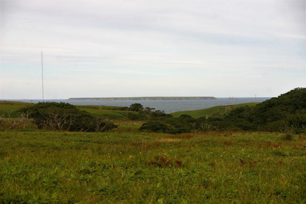 ユルリ島は、根室半島の南側、花咲港や落合漁港に近い場所にある、周囲7.8kmの島です。島の周囲は崖になっていますが、標高40m位で台地状になって大部分が平らになっています。そのため、遠くから見ると、海に浮かぶ航空母艦のように見えます。