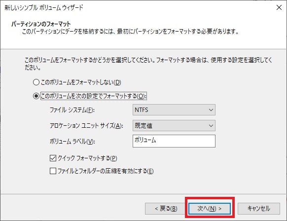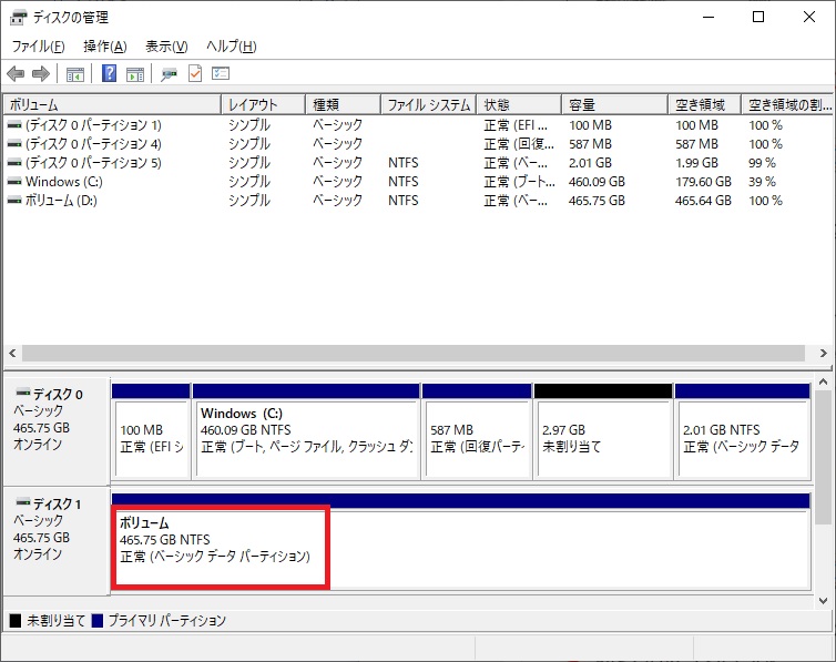 ディスクの管理で確認します。全領域がNTFSで作成されたことを確認します。