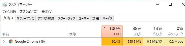 リストのCPUのタイトル部分をクリックすると、プロセスをCPU使用率の昇順、降順で並べることができます(メモリ以降も同様)。例では、CPU使用率が100%で、「google chrome」がCPUの6割も占有していることが分かります。